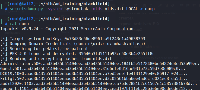 secretsdump.py -system system.bak -ntds ntds.dit LOCAL > dump