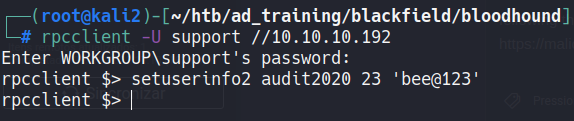 bloodhound-python -ns 10.10.10.192 -d BLACKFIELD.local -u support -p "#00^BlackKnight" -c All