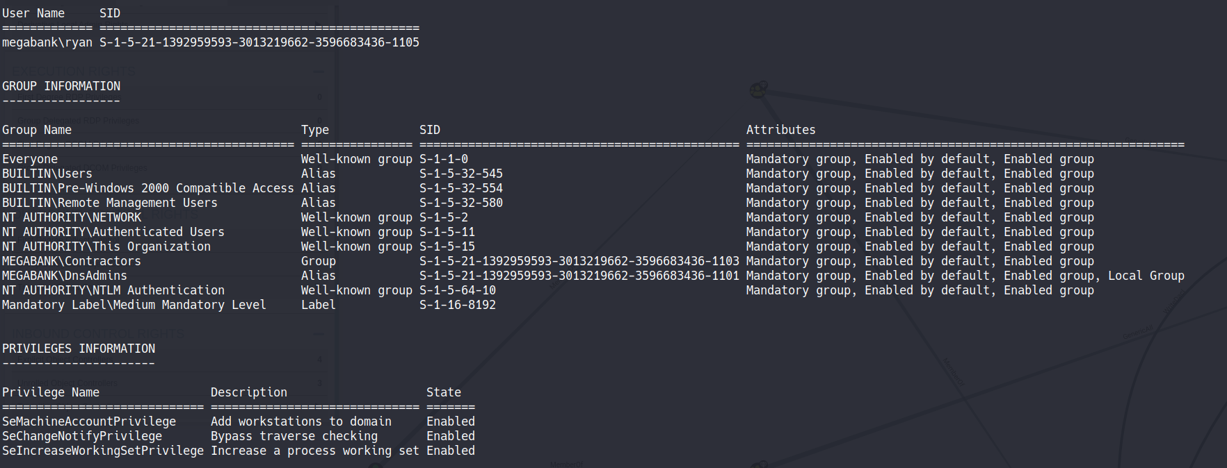 With whoami command we discovery that the user ryan are member of group DnsAdmins