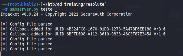 I tried pass the payload to the machine some times and using differents ways, but no succes, then i setup an smb server using impacket script: