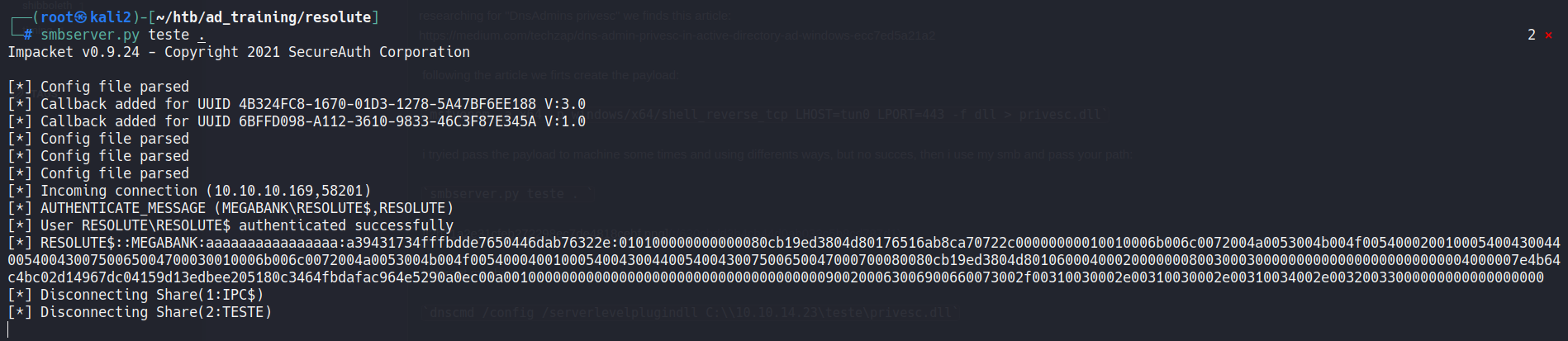Researching about “DnsAdmins privesc” we find this article, that help us on the privesc.
