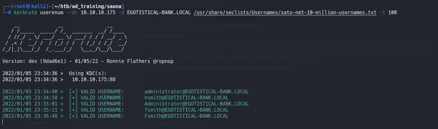 kerbrute userenum --dc 10.10.10.175 -d EGOTISTICAL-BANK.LOCAL /usr/share/seclists/Usernames/xato-net-10-million-usernames.txt -t 100