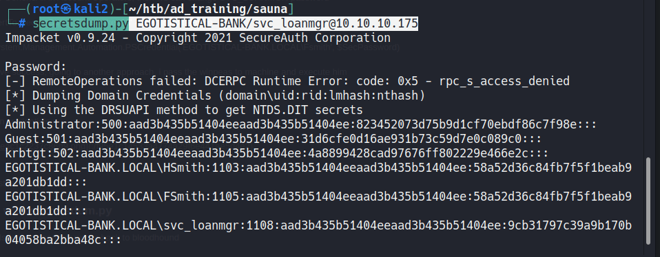 secretsdump.py EGOTISTICAL-BANK/svc_loanmgr@10.10.10.175